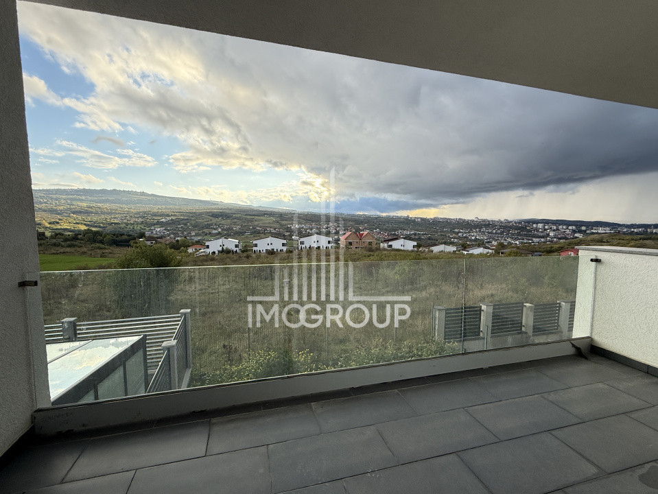 Unul dintre dormitoare are ieșire către curte, iar celălalt către o terasă spațioasă cu priveliște panoramică asupra orașului și dealului Feleac