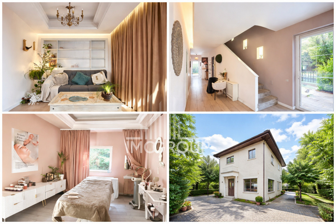 Parter: hol cu oficiu/garderobă, zonă cosmetică & coafor, spațiu recepție și așteptare, baie, 3 accese separate, ceea ce permite compartimentare sau funcționare independentă